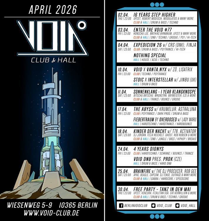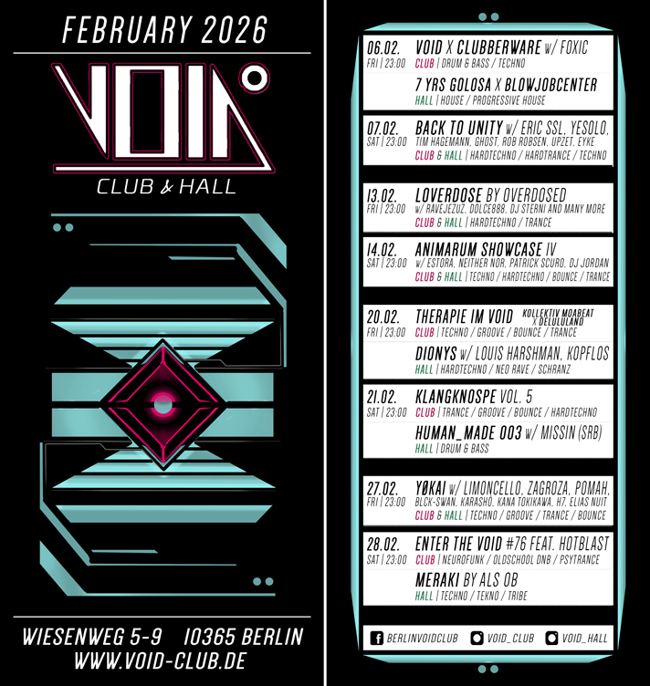 By ravers for ravers: The VOID Club, founded in July 2015, is Berlin's home for first-class music and unforgettable nights. Drum & Bass, Techno, Hardtechno, Psytrance, House, Hardcore and Bass Music are just some of the genres that are celebrated on our floors.
