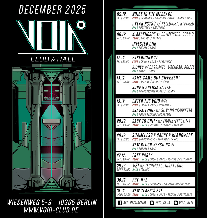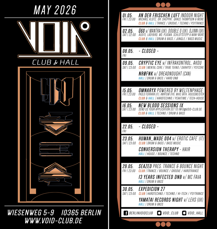 By ravers for ravers: The VOID Club, founded in July 2015, is Berlin's home for first-class music and unforgettable nights. Drum & Bass, Techno, Hardtechno, Psytrance, House, Hardcore and Bass Music are just some of the genres that are celebrated on our floors.