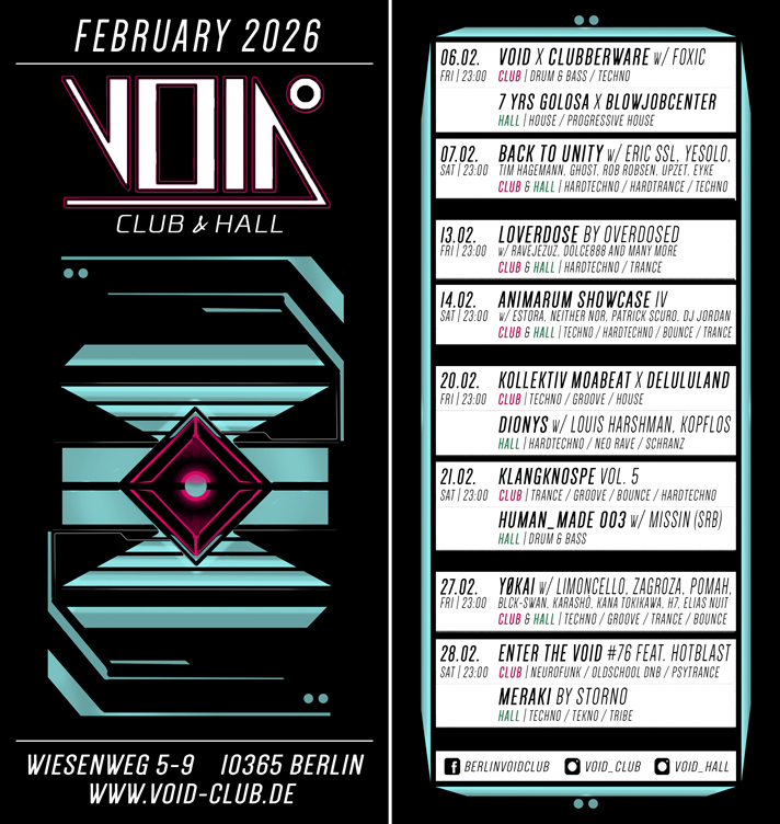 By ravers for ravers: The VOID Club, founded in July 2015, is Berlin's home for first-class music and unforgettable nights. Drum & Bass, Techno, Hardtechno, Psytrance, House, Hardcore and Bass Music are just some of the genres that are celebrated on our floors.